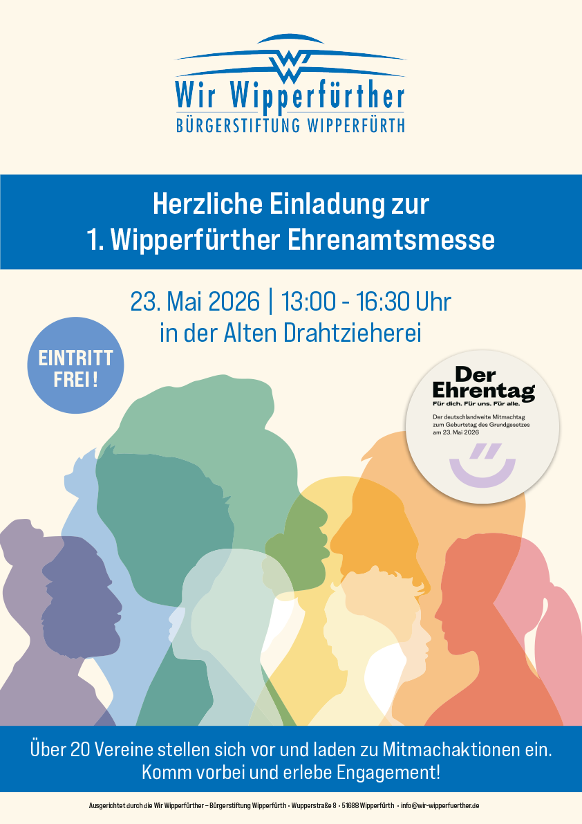 1. Wipperfürther Ehrenamtsmesse am 23. Mai 2026 16.04.2026 Der Ehrentag! Für dich. Für uns. Für alle.Am Samstag, 23.05.2026, von 13:00 bis 16:30 Uhr lädt die Bürgerstiftung „Wir Wipperfürther“ zur großen ... Weiterlesen